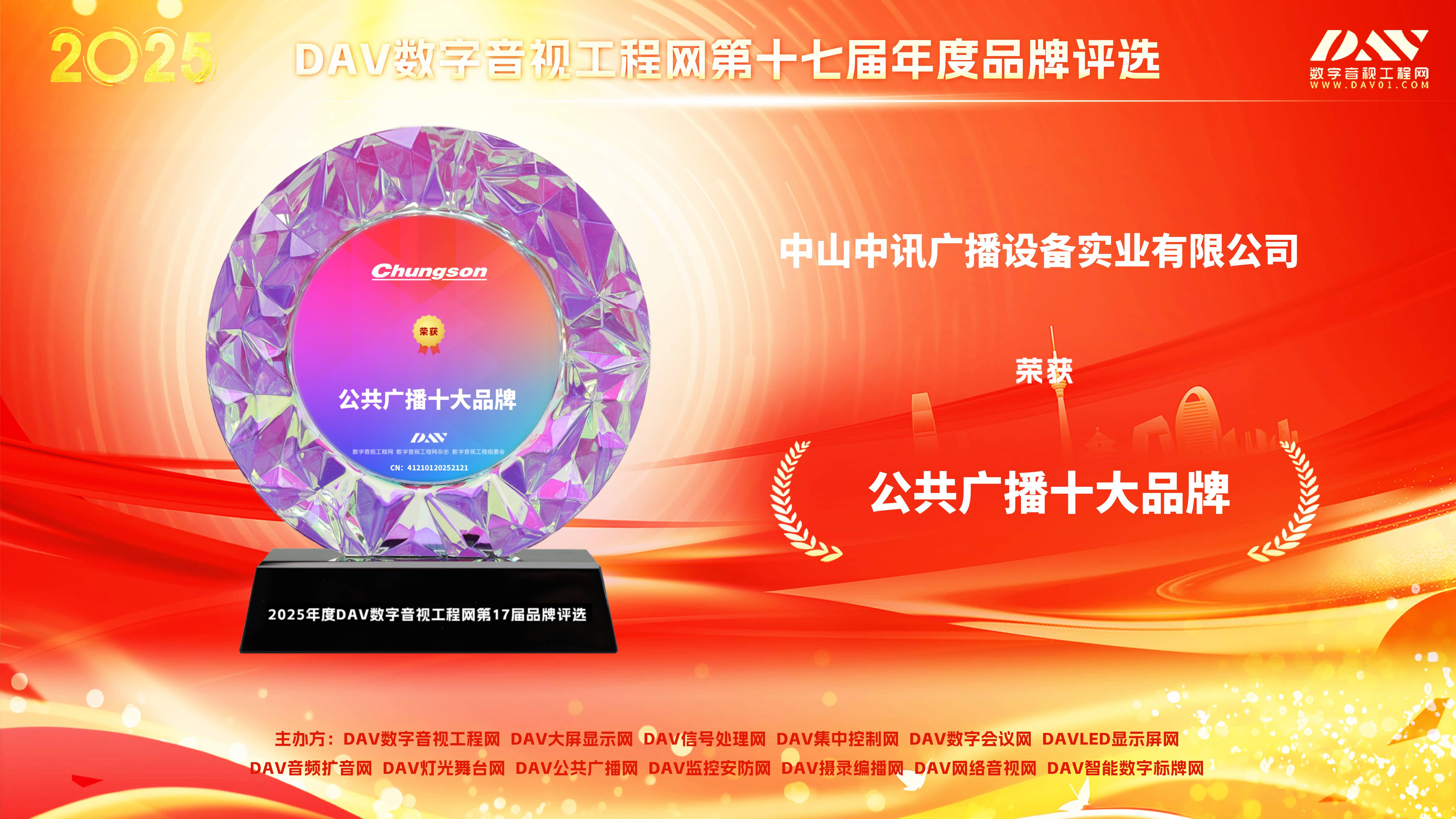 2025年12月20日,由DAV数字音视工程网与《数字音视工程》杂志联合主办的“第17届音视频行业品牌评选”结果正式公布。中山市中讯公共广播设备实业有限公司凭借在公共广播与会议扩声领域的深厚制造底蕴与广泛项目落地,一举斩获 “公共广播十大品牌”(CN: 41210120252121)与 “会议扩音十大品牌”(CN: 41210120252122)两项大奖。