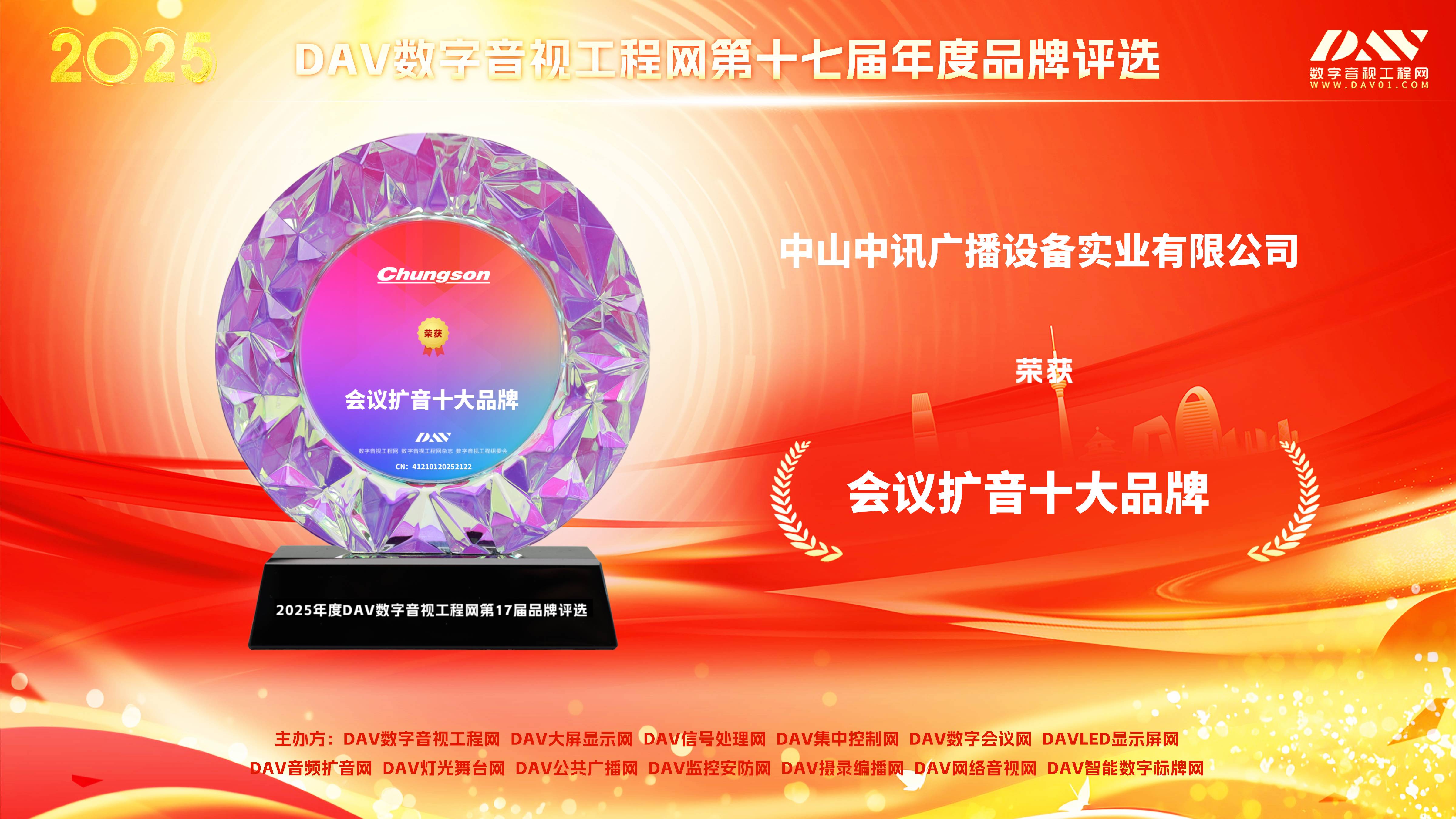 2025年12月20日,由DAV数字音视工程网与《数字音视工程》杂志联合主办的“第17届音视频行业品牌评选”结果正式公布。中山市中讯公共广播设备实业有限公司凭借在公共广播与会议扩声领域的深厚制造底蕴与广泛项目落地,一举斩获 “公共广播十大品牌”(CN: 41210120252121)与 “会议扩音十大品牌”(CN: 41210120252122)两项大奖。